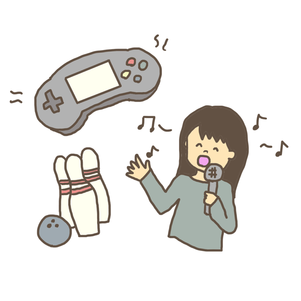 (ドライブ、パチンコ、スポーツ観戦、ボーリング、映画、ゲームセンター、カラオケ、食べ歩き)